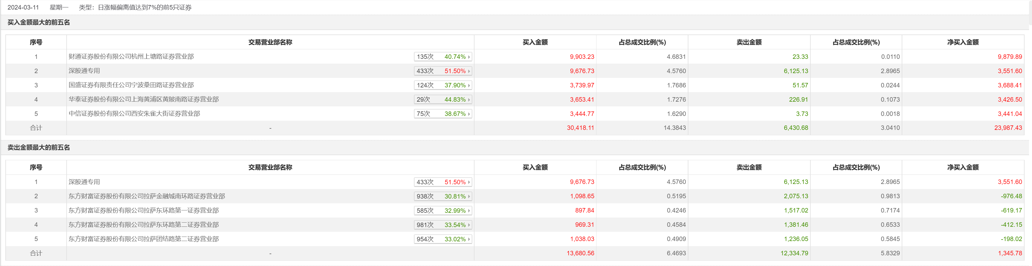 3月11日,拓维信息今日涨停,成交额21.15亿元,换手率11.67%,盘后龙虎榜数据显示,上塘路席位净买入9879.9万元,深股通专用席位买入9676.73万元并卖出6125.13万元。