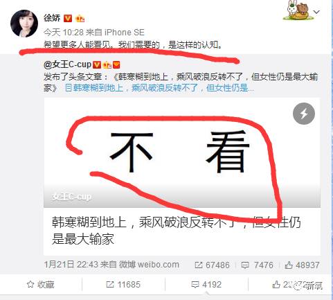 所以直接就有了开头的徐娇小姑娘微博上严重抗议的宣言,她还真的是娱乐圈里第一个对这件事公开直接怼韩寒的。
