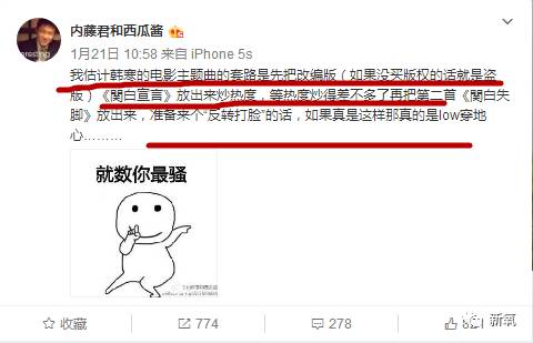 知道这首歌有两部分的人已经预言了韩寒会利用这个来炒热度,等热度炒的差不多再把第二首给放出来,给大家来一个反转。看他们微博上时间,都是在韩寒发博之前。