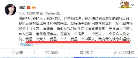 在身为一个演员,一个艺人,一个公众人物之前,我是一个女人,我是一个人,我是一个中国人,我有我的信念和坚持。真想起来给她鼓个掌。