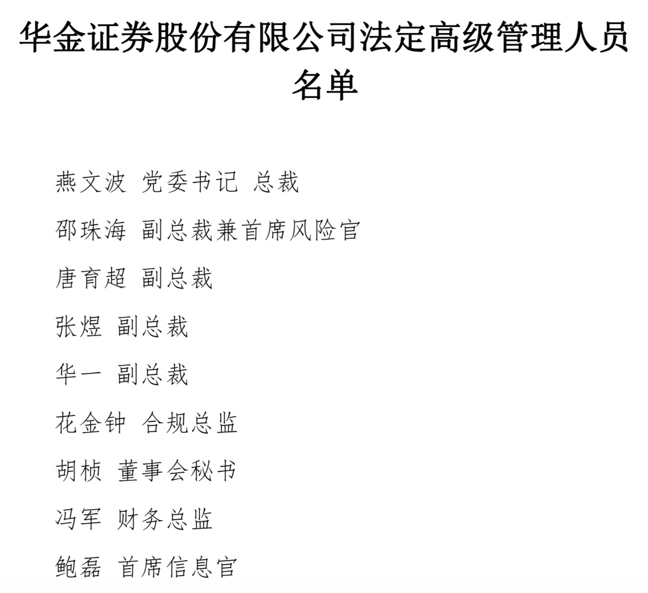 此外,在过去的一年,华金证券高管变动较为频繁。具体来看,2023年6月,华金证券原副总裁金葵华、副总裁胡旭、原首席风险官郭晓晖离任。2023年12月,平安银行金融同业事业部营销总监华一入职华金证券任副总裁。