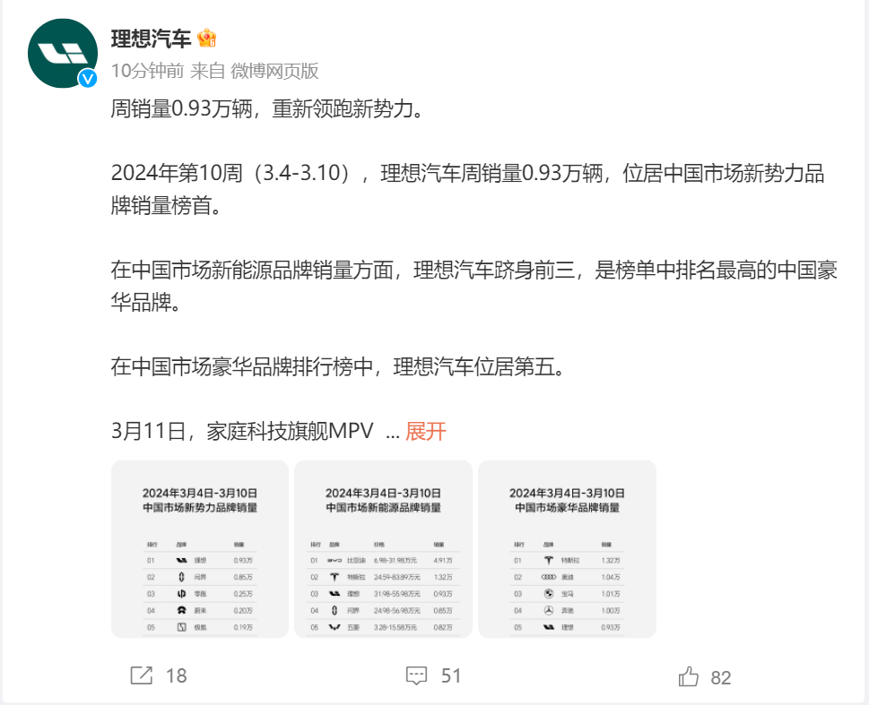 据理想汽车微博3月12日消息,2024年第10周(3.4—3.10),理想汽车周销量0.93万辆,位居中国市场新势力品牌销量榜首。