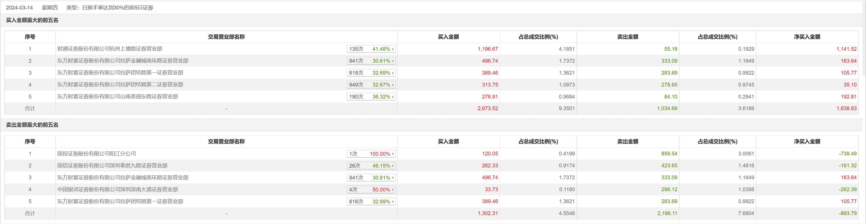 具体来看,财通证券杭州上塘路证券营业部、东方财富证券拉萨金融城南环路证券营业部分别买入1196.67万元、496.74万元;国投证券阳江分公司、国信证券深圳泰然九路证券营业部分别卖出859.54万元、423.65万元。