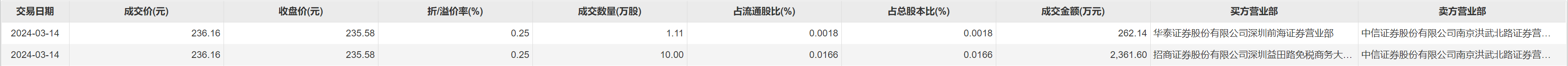 片仔癀3月14日大宗交易成交11.11万股,成交额2623.74万元,占当日总成交额的7.19%,成交价236.16元,较市场收盘价235.58元溢价0.25%。