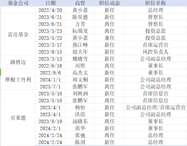 今年2月24日,贝莱德基金发布高级管理人员变更公告。公告称,原总经理张弛因个人原因离任,任命陈剑为贝莱德基金代任总经理。今年年初,贝莱德宣布任命陈蕙兰为亚太区主管,任命范华为中国区负责人。2023年6月份,贝莱德原董事长汤晓东因个人原因从公司离职。