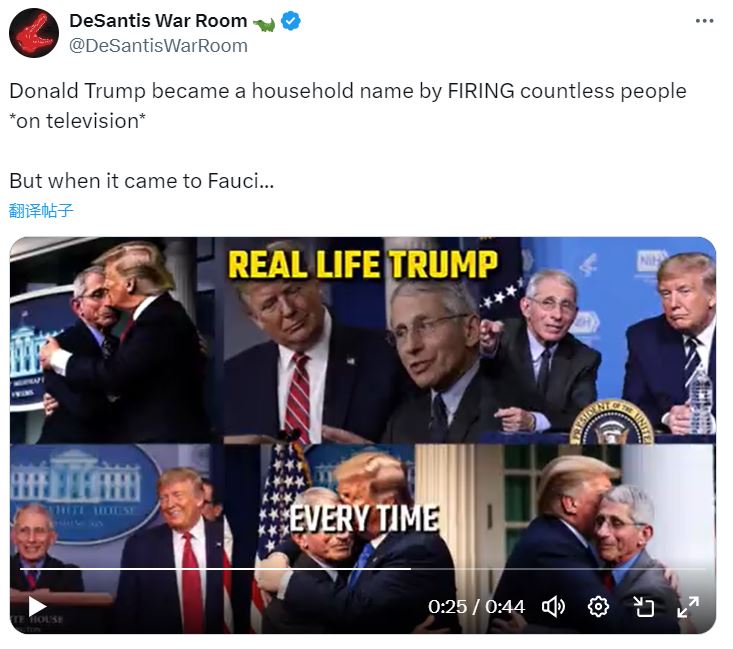 德桑蒂斯的团队在视频中使用了特朗普接受采访时的音频配以福奇的照片。视频中有一帧是特朗普与福奇的合影锦集,锦集中有三张照片显示特朗普拥抱福奇、亲吻福奇的额头,意图说明特朗普与保守派厌恶的福奇关系密切。