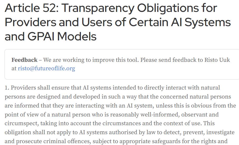 该法条还对AI文本生成做出了规定。如果AI系统生成或处理的文本是为了让公众知晓与公共利益有关的信息,则开发方应披露相关文本为AI生成或处理。但如果AI生成的相关文本经过人类检查或编辑,并且有自然人或法人对内容发布承担编辑责任,则无需披露文本为AI生成。