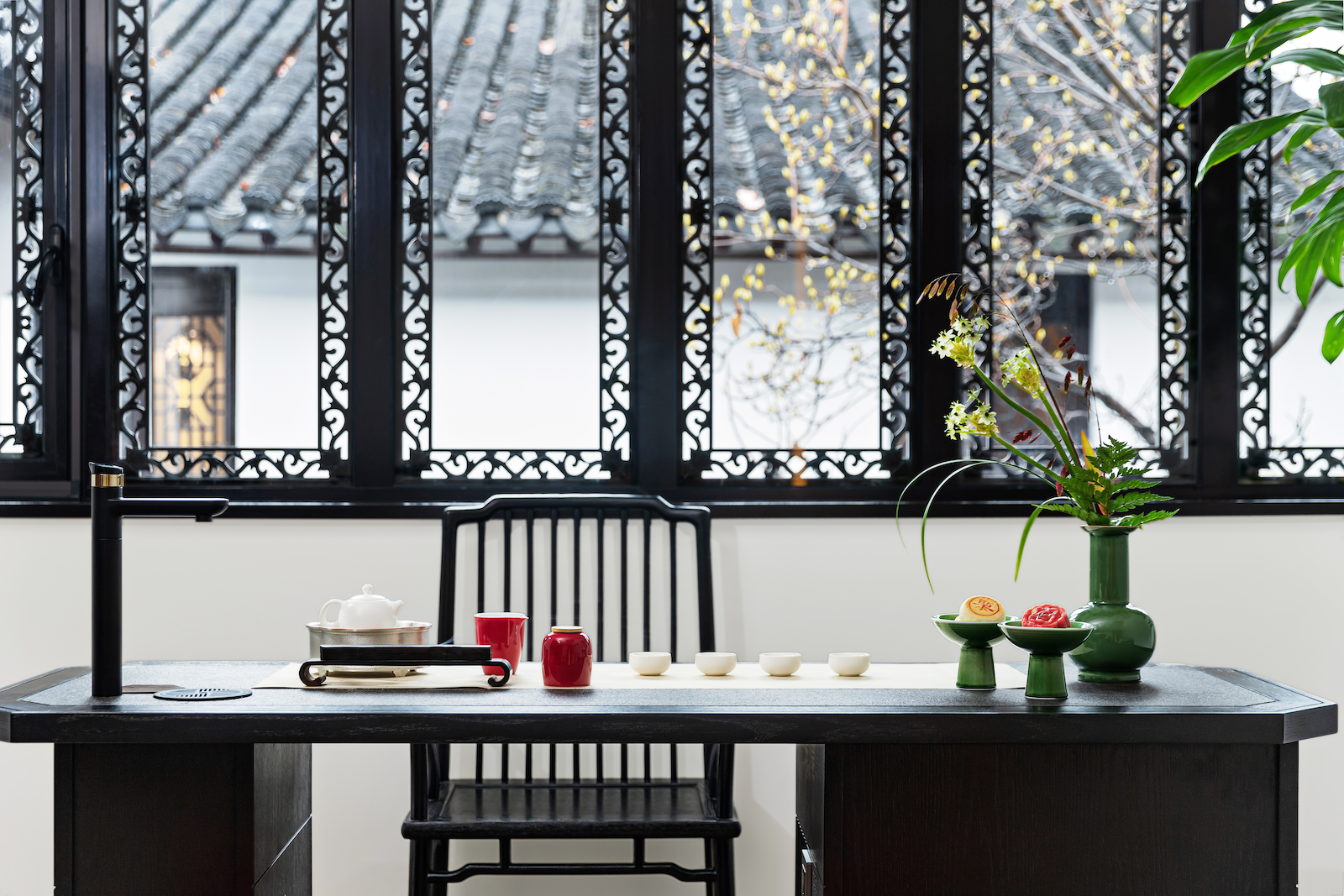它坐落于平江历史街区菉葭巷56号,前身为晚清重臣潘祖荫的夫人汪氏的故居,距今已有近三百年历史。颐和团队与主案设计师张光德先生充分尊重、维护和增强古宅的尊严为基础,以“活化利用”的方式赋予了潘宅新的活力。老宅原有的全部庭院空间被保留,仅对其地面做了传统苏州园林特有的“地上织绣”,即花街铺地。公共空间摆放了多件设计师走访江浙一带寻来的明清老家具,与漏窗、洞门等园林特色元素低调呼应,自然而然营造出精致古朴、雅趣万千的姑苏气韵。