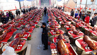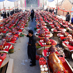 供奉完神灵之后,做年例的人家就可以全心全意招待从四面八方、远道而来的亲朋好友,这也到了当天最热闹的时候。家家户户在自己的家里摆设酒席,多则二三十桌,少则三五桌,将美味佳肴悉数奉上。