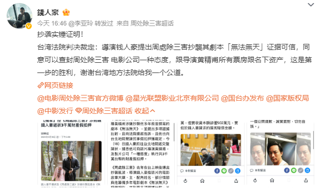 导演钱人豪对电影《周处除三害》提起著作权侵权的诉讼有了最新进展。3月18日,钱人豪在微博发文表示,“台湾地区法院判决裁定《周处除三害》抄袭导演钱人豪剧本《无法无天》证据可信,同意查封《周处除三害》制片公司“一种态度”电影股份有限公司及导演黄精甫所有票房及名下资产。”这段比较冗长且内含法律术语的微博,让旁观者有些惊讶。其实,关于《周处除三害》的著作权侵权一事,双方的指控和否认,已有将近半年时间。