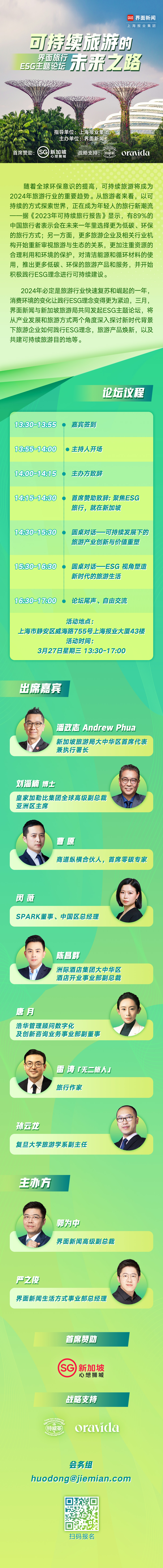 2024年必定是旅游行业快速复苏和崛起的一年,消费环境的变化让践行ESG理念变得更为紧迫,在此背景下,界面新闻与新加坡旅游局将于3月27日下午13:00在上海市静安区威海路755号上海报业大厦43楼共同发起“界面旅行ESG主题论坛”,从产业发展和旅游方式两个角度深入探讨新时代背景下旅游企业如何践行ESG理念,旅游产品焕新,以及共建可持续旅游目的地等。