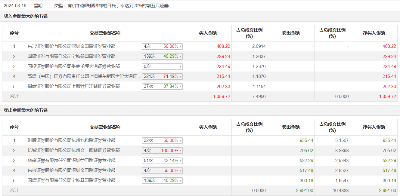 具体来看,知名游资现身龙虎榜,东兴证券深圳金田路证券营业部、宁波桑田路(国盛证券宁波桑田路证券营业部)分别买入488.22万元、229.24万元;财通证券杭州九和路证券营业部、长城证券杭州文一西路证券营业部分别卖出935.44万元、705.62万元。