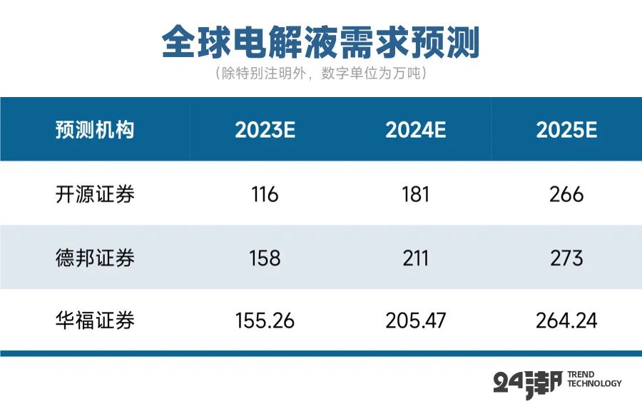 从产业趋势看,未来电解液市场需求也将大概率保持增长趋势,综合券商分析预测,2025年全球电解液需求约为264-273万吨。