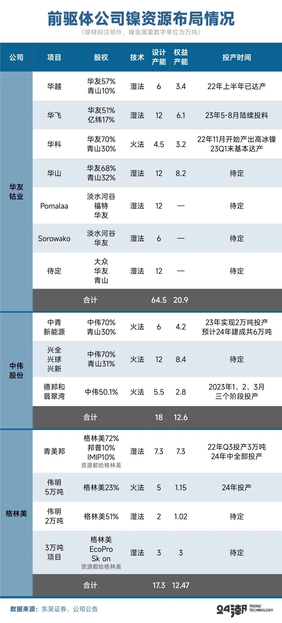 在产业竞争加剧的背景下,为了增强企业自身经营实力,很多企业选择加速一体化布局。尤其龙头厂商镍冶炼产能逐步释放,一体化比例明显提升。比如 “华友钴业华越6万吨满产,华科4.5万吨23Q1末达产,华飞12万吨23年5-8月陆续投料,预计23年镍冶炼出货有望达12-14万金吨(权益8万金吨左右),年底自供率达到近70%;中伟股份当前硫酸镍自供比例达90%,年底镍铁自供率达到15%左右;格林美23年镍出货预计2.5万吨,并且启动二期,规划从2万吨增长至4.3万吨,明年年中建成投产。”