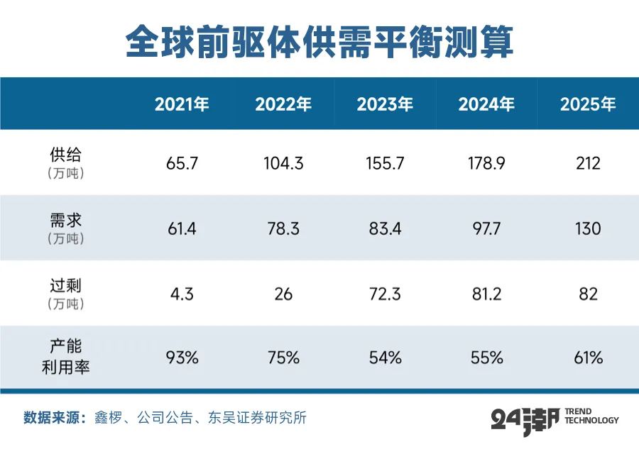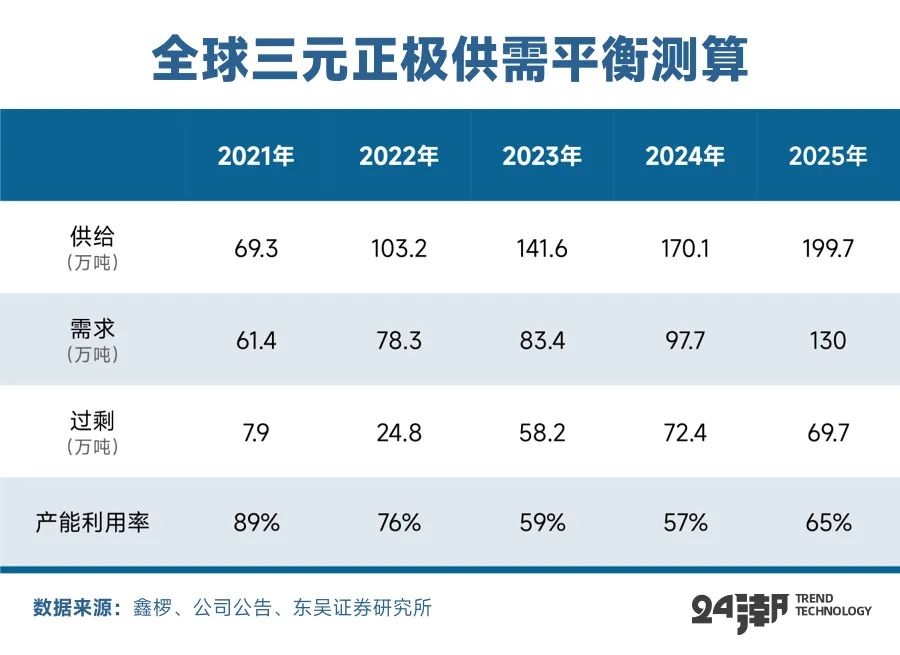 不过,随着新产能的加速释放,三元前驱体正在成为锂电产业产能过剩最严重的赛道之一。比如根据东吴证券预测,24年三元前驱体领域预计新增供给20万吨+,新增需求约14万吨,产能利用率仍维持低位55%。