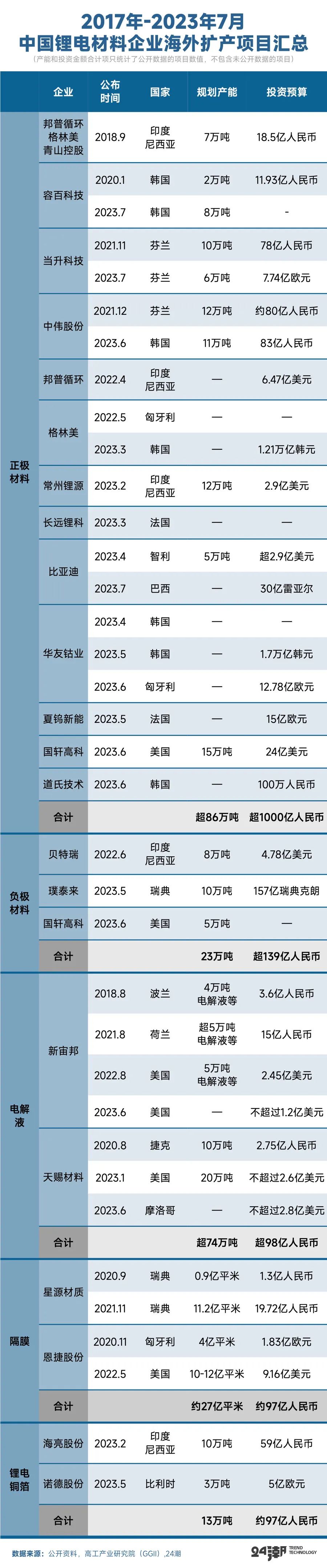 此外据高工产业研究院(GGII)不完全统计,截至2023年7月23日,我国已有22家锂电材料企业公布海外扩产项目37个,合计投资金额超1370亿元。其中仅统计2023年初至7月23日期间,就有16家企业公布海外扩产项目20个,合计投资金额超957亿元,扩产项目数量和合计投资金额占近几年总扩产项目的比重分别高达54%和69%以上。
