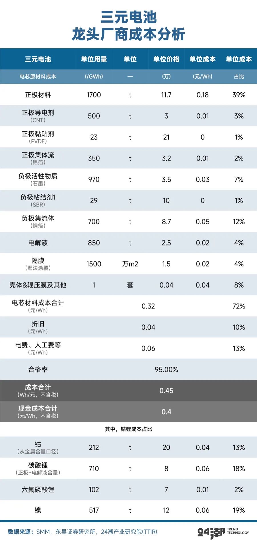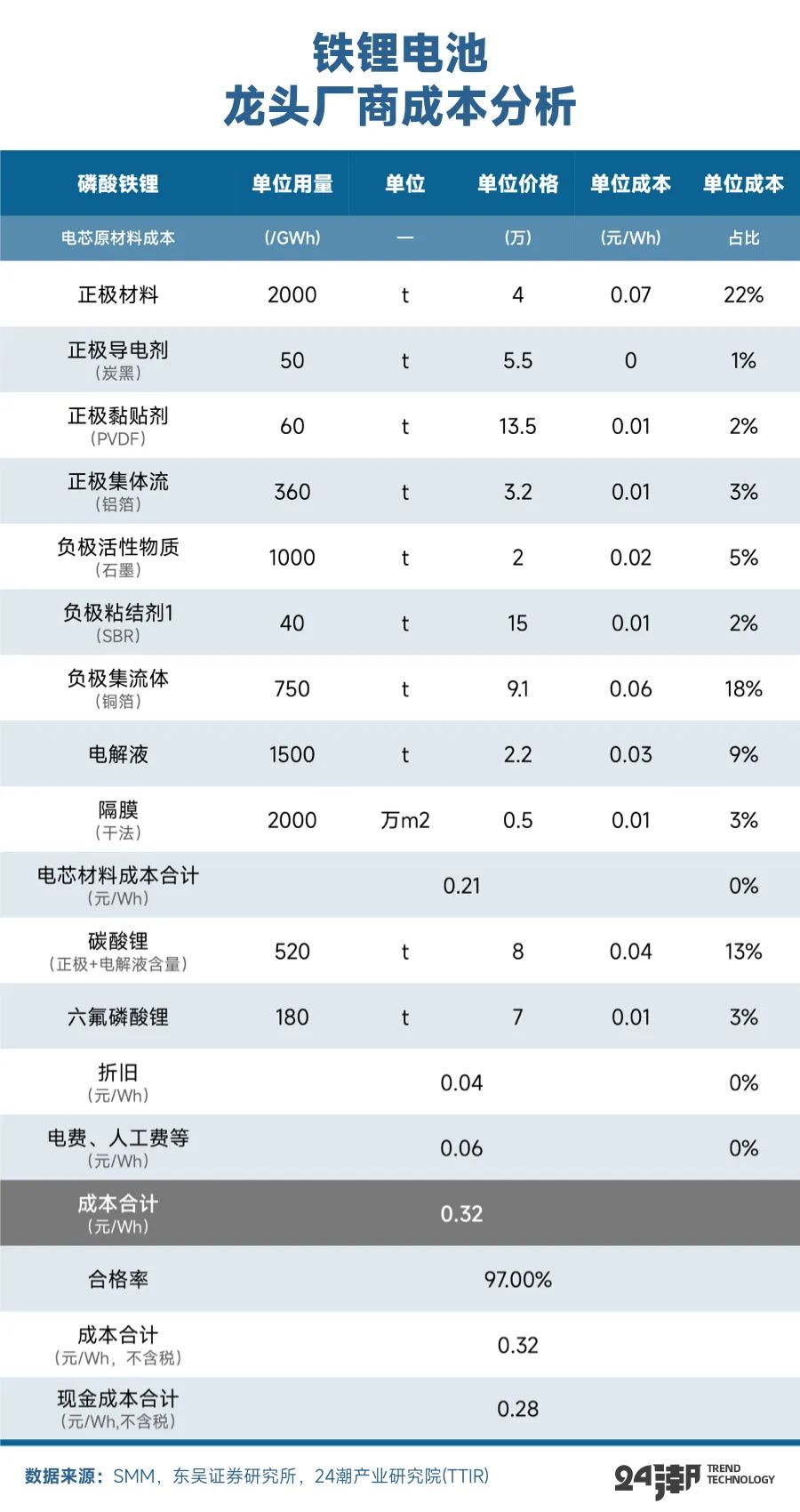 根据东吴证券分析测算,按照碳酸锂8万价格测算,龙头铁锂电芯成本预计0.32元/Wh左右(不含税),龙头三元523电芯成本预计0.45元/Wh左右(不含税);而二线厂商铁锂与三元电芯成本约分别为0.37/Wh和0.50/Wh左右。