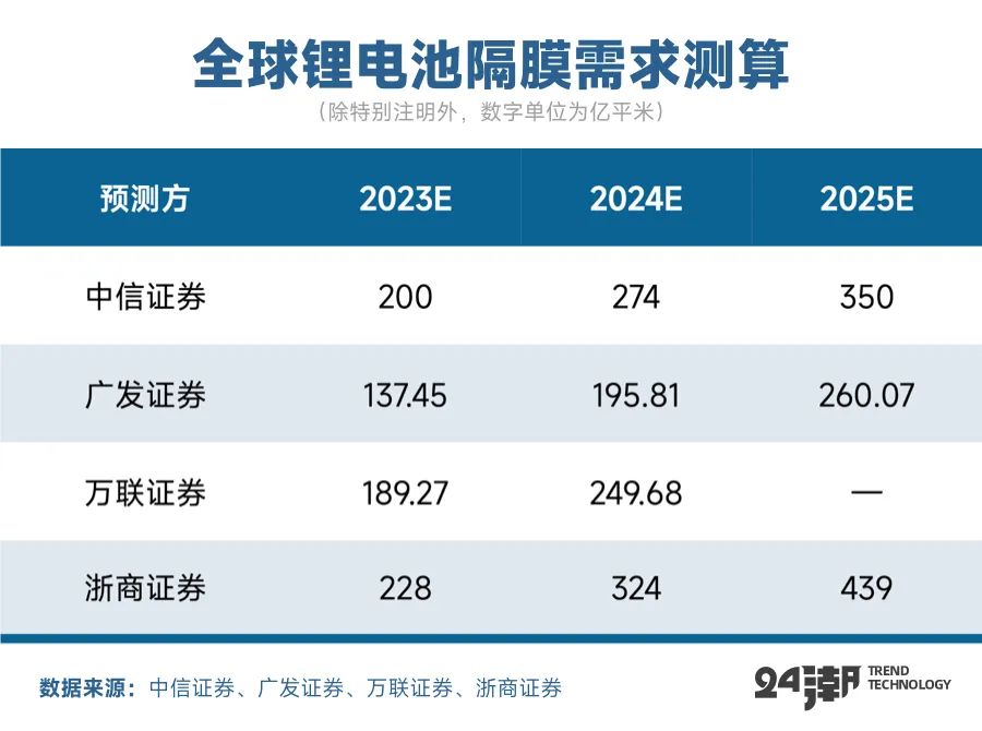 在新能源产业崛起的大势下,锂电隔膜需求量未来几年大概率仍将保持增长趋势,综合中信证券、浙商证券、广发证券等券商分析2025年全球锂电池隔膜需求约为260-439亿平米。