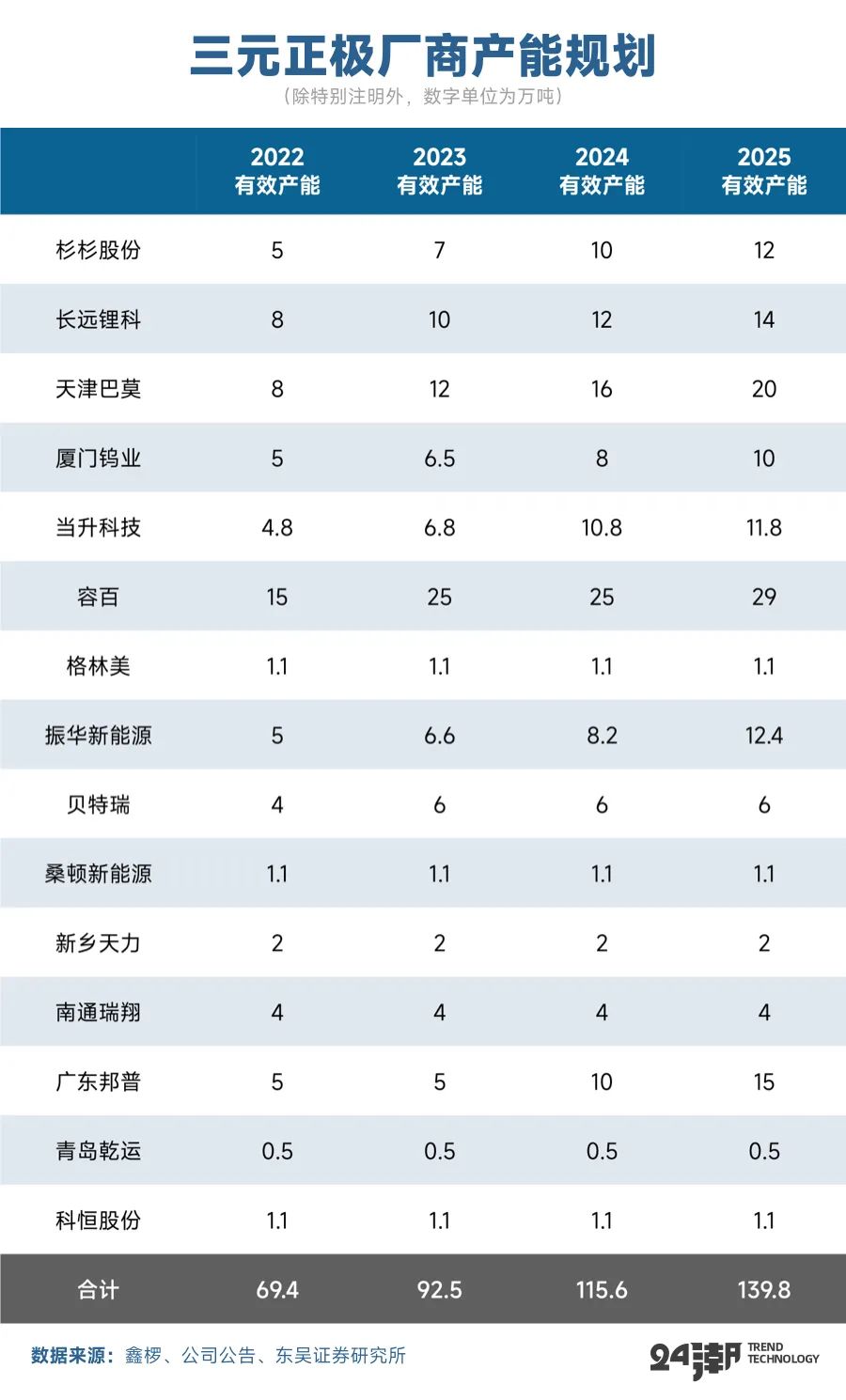 综合鑫椤锂电、东吴证券等机构分析与预测,2025年三元正极材料需求约为130万吨,而供给可能达到199.7万吨,过剩产能达69.7万吨;而2025年磷酸铁锂正极材料需求约为247.4万吨,而供给可能达到361.2万吨,过剩产能约为113.8万吨,两者均呈现产生过剩趋势。