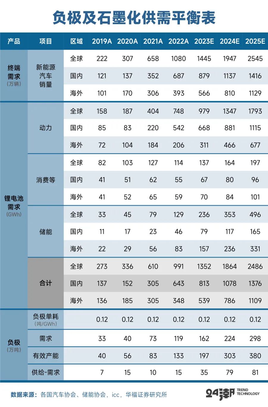 而据鑫椤资讯预测, 到2023年年末,负极材料名义产能将达440万吨左右,远超上述负极材料需求预测;另据华福证券分析预测,2023年-2025年,全球负极材料 “产能-需求” 分别为35万吨、79万吨和81万吨,加速趋势非常明显。
