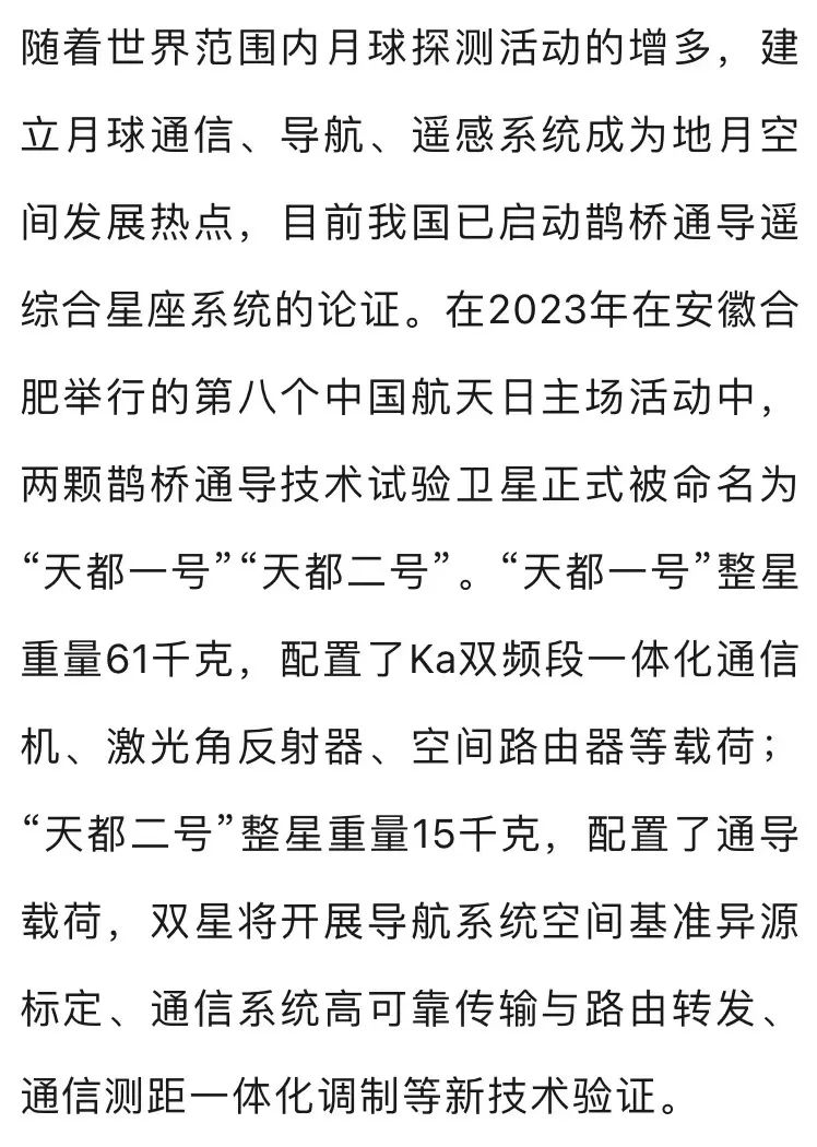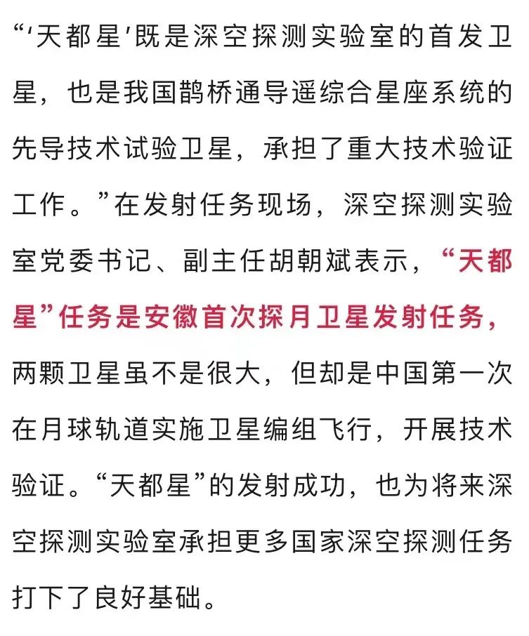 此次任务中,伴随着鹊桥二号中继星共同“奔月”的还有两颗由位于安徽合肥的深空探测实验室牵头研制的天都一号、二号通导技术试验星,双星将在月球轨道编队飞行,实施月球轨道通信导航新技术验证。