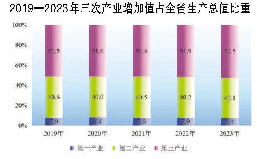 2023年全省第一产业增加值3496.6亿元,增长3.9%;第二产业增加值18871.8亿元,增长6.1%;第三产业增加值24682.2亿元,增长5.8%。工业增加值14021.1亿元,增长6.2%。三次产业结构由上年的7.9∶40.2∶51.9调整为7.4∶40.1∶52.5。预计全年全员劳动生产率147934元/人,比上年增加8339元/人。按常住人口计算,人均地区生产总值76830元(折合10903美元),增长5.7%。