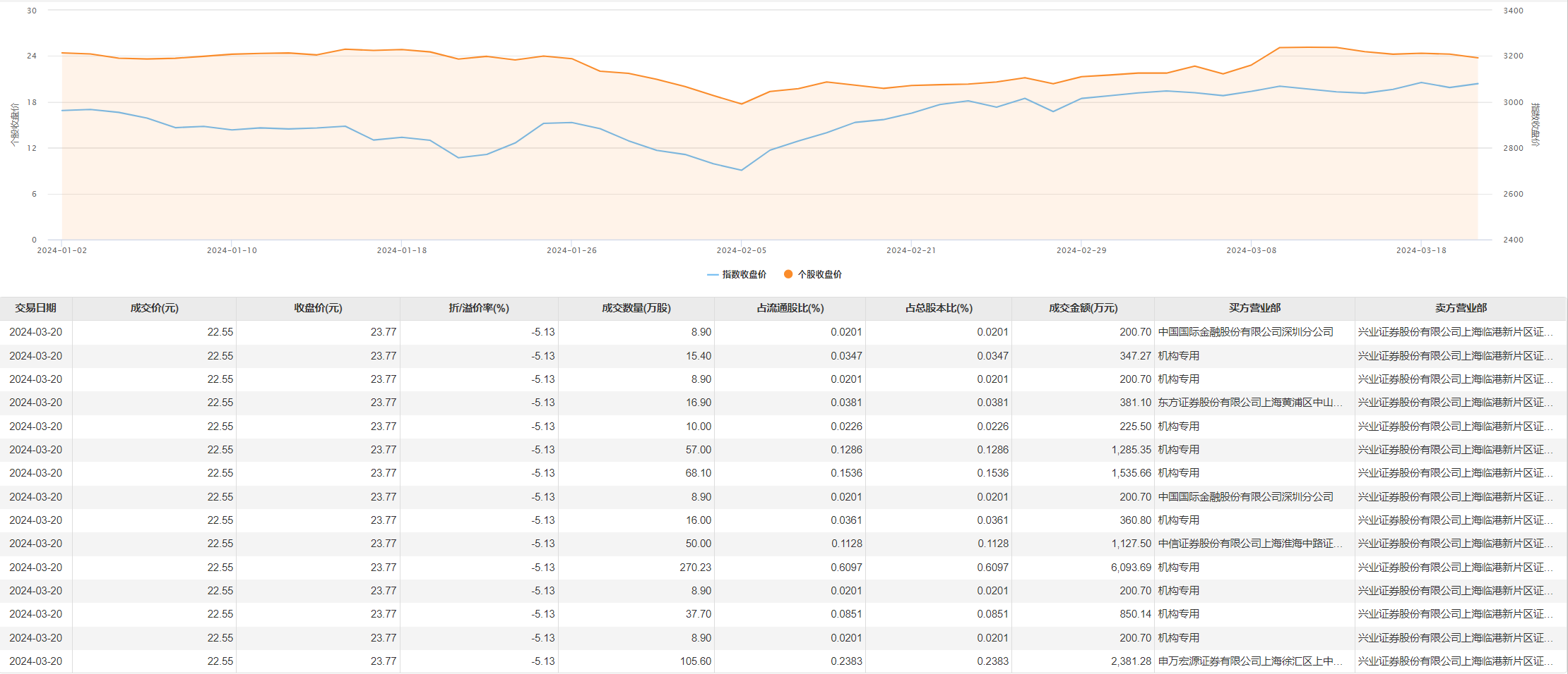 禾望电气3月20日大宗交易成交691.43万股,成交额1.56亿元,占当日总成交额的54.97%,成交价22.55元,较市场收盘价23.77元折价5.13%。