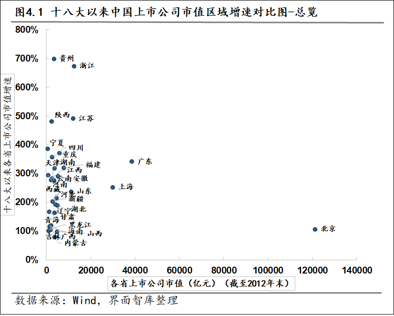 我们发现,十八大以来,中国上市公司的数量呈现出稳步增长的趋势,市值规模同步不断扩大,上市板块也日益多元化。同时,我们还注意到,各省市在不同经济基础、产业结构、政策支持和市场环境的背景下,呈现出强者恒强的态势。