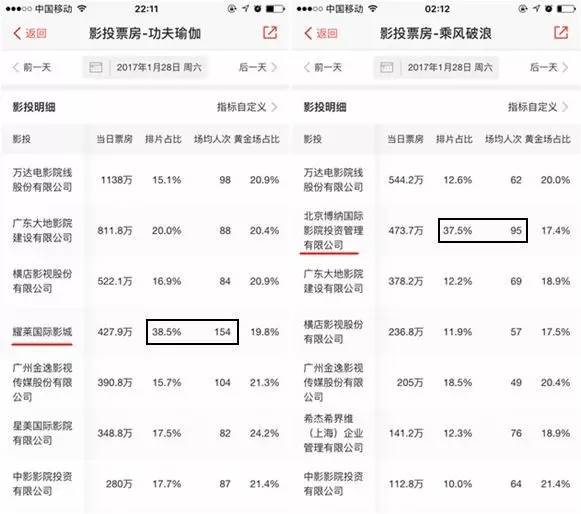 《功夫瑜伽》是耀莱影视主控,耀莱有大量自营影院,所以,上映首日,这部片在所有耀莱影城的场均人次高达154人,把通常场均人次最高的万达院线都远远甩在了后面。《乘风破浪》是博纳投资的电影,同样,该片首日在博纳影城的场均人次高达95人,也把万达院线远远甩在了后面。