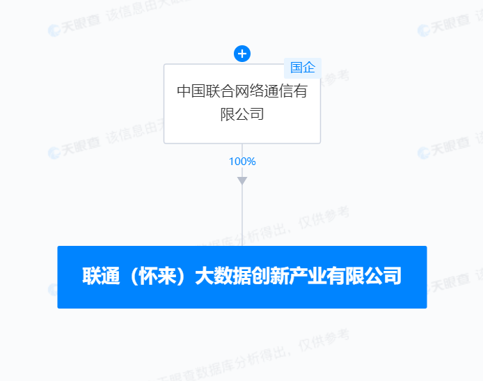 天眼查App显示,近日,联通(怀来)大数据创新产业有限公司成立,法定代表人为许杰,注册资本5000万元,经营范围含互联网数据服务、5G通信技术服务、大数据服务、人工智能应用软件开发、人工智能行业应用系统集成服务、人工智能公共服务平台技术咨询服务等。股东信息显示,该公司由中国联合网络通信有限公司全资持股。