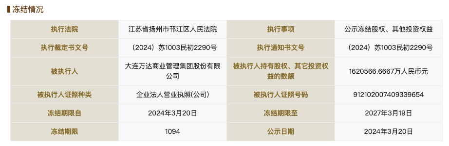国家企业信用信息公示系统网站显示,3月20日,大连万达商业管理集团股份有限公司新增一则股权冻结信息,冻结股权数额约162亿人民币,股权被执行的企业为大连新达盟商业管理有限公司,冻结期限自2024年3月20日至2027年3月19日,执行法院为江苏省扬州市邗江区人民法院。