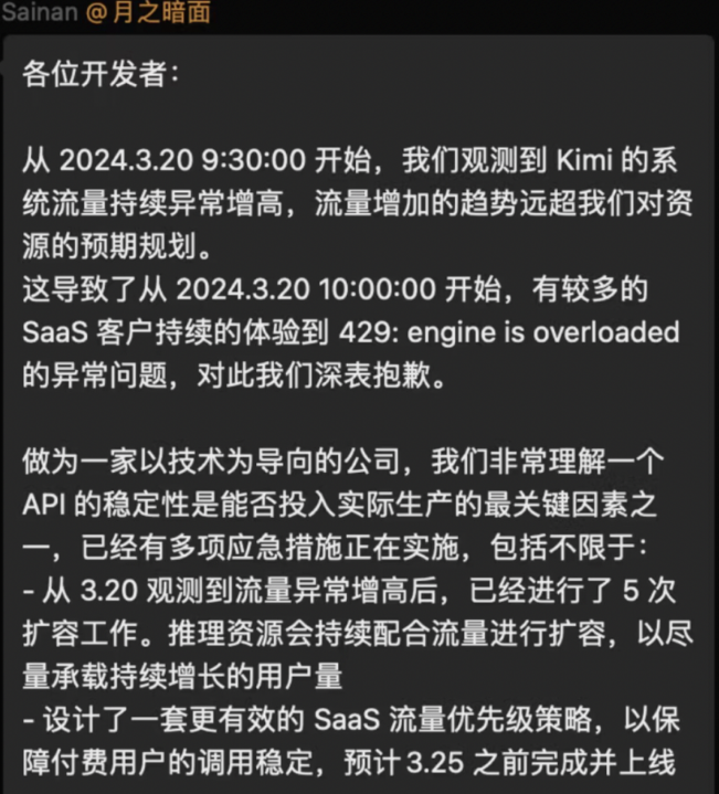 市场的火爆,也让Kimi的APP和小程序系统流量持续异常增高,并在3月21日下午一度宕机,无法正常使用。面对这种情况,其母公司月之暗面发布了说明:从3月20日9点30分开始,观测到Kimi的系统流量持续异常增高,流量增加的趋势远超对资源的预期规划。这导致了从20日10点开始,有较多的SaaS客户持续的体验到429:engine is overloaded的异常问题,并对此表示深表抱歉。