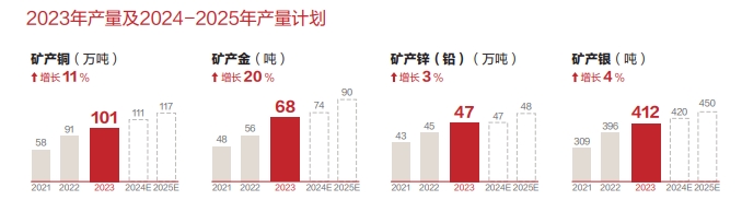黄金方面,因地缘冲突升级、全球主要央行降息预期增强、央行持续购金等多重因素支撑,国际金价大幅上涨,成为年度最具吸引力的投资品。紫金矿业金产量位居主要上市矿企中国第一。