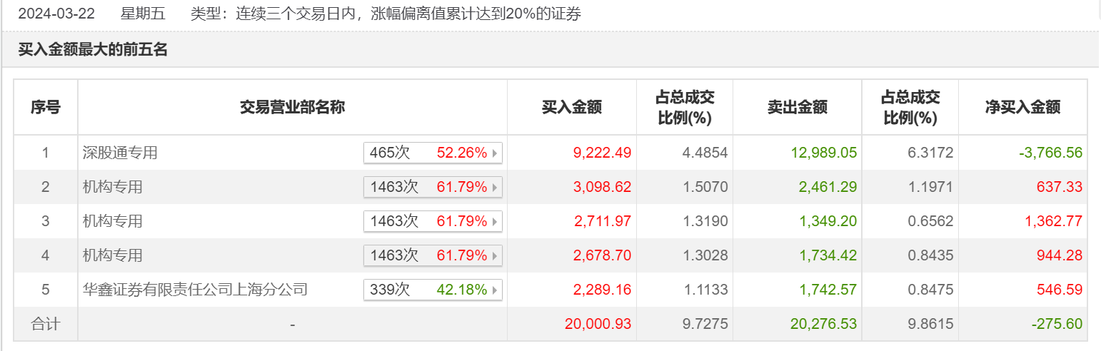 值得注意的是,机构席位大笔吃货拉高股价,深股通专用席位趁机高位减持。交易异动成交营业部数据显示,机构用户正在增持该只股票。比如,3家机构专用席位3月22日合计买入近8500万元,合计卖出超5540万元。而深股通专用席位就趁机高位出货,3月22日买入9222万元,卖出就高达近1.3亿元。