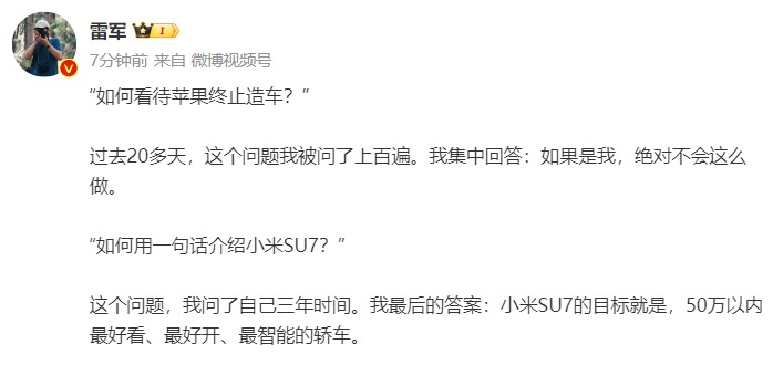 3月25日,雷军发微博回应“如何看待苹果终止造车?”:如果是我,绝对不会这么做。雷军同时表示,小米SU7的目标就是,50万以内最好看、最好开、最智能的轿车。