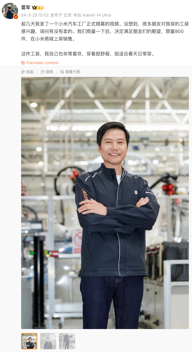 3月25日下午,小米创办人、董事长兼CEO雷军在微博发文称,“前几天我发了一个小米汽车工厂正式揭幕的视频。没想到,很多朋友对我穿的工装感兴趣,询问有没有卖的。我们商量一下后,决定满足朋友们的期望,限量800件,在小米商城上架销售。”而据小米商城显示,该款工装售价为299元。
