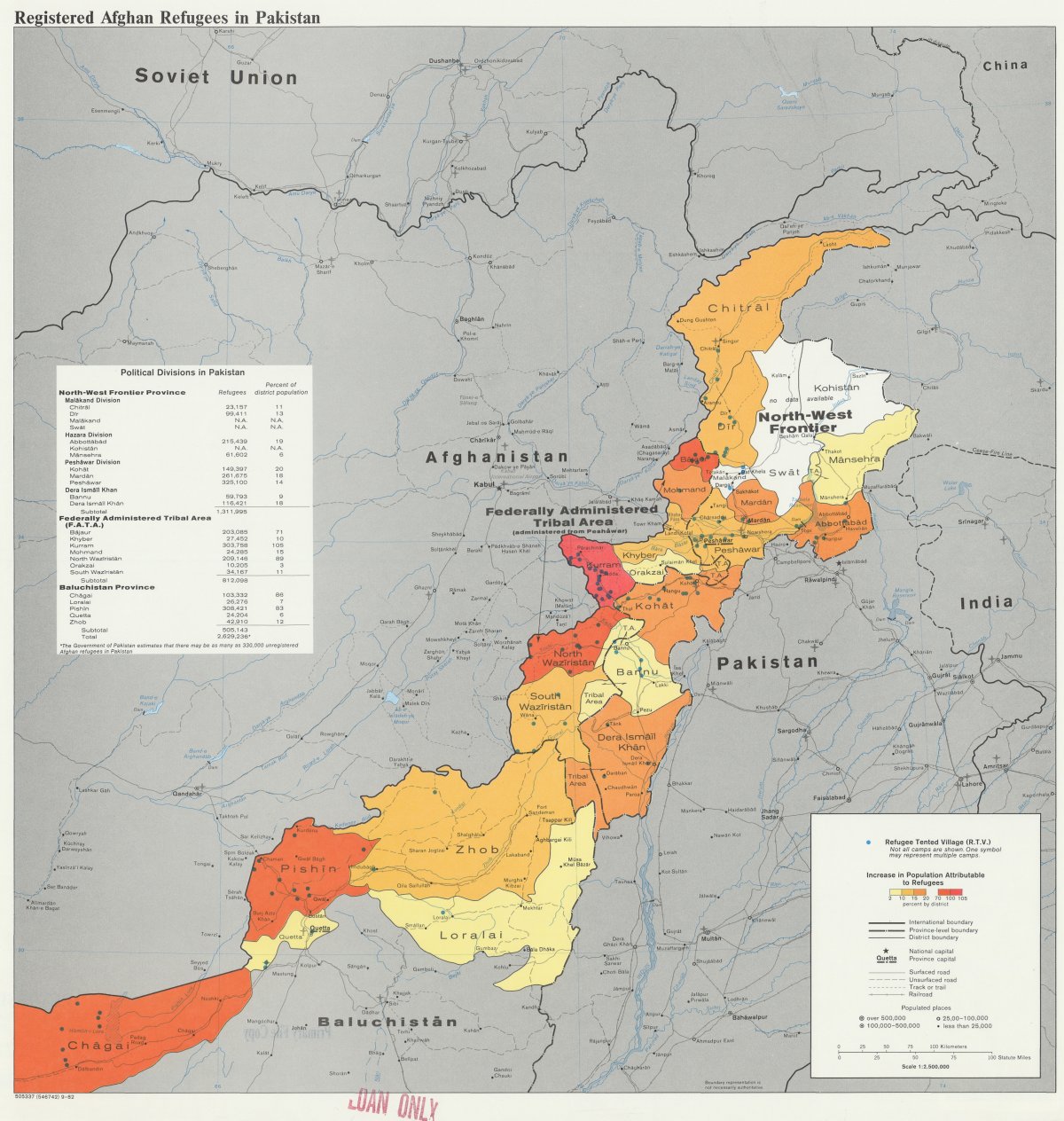 1982年阿富汗-巴基斯坦边境难民移动造成的人口变化↓
