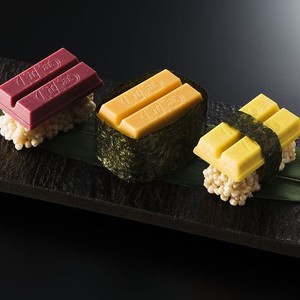 寿司KitKat共有三种口味。金枪鱼寿司KitKat上其实是一块低糖覆盆子巧克力,颜色也和暗红色的金枪鱼身相似;海苔包着的海胆KitKat则完全复制了海胆寿司的形状,而口味则是北海道蜜瓜;玉子烧KitKat则是南瓜布丁口味。寿司米也是长得像米的甜味膨化零食——简直是低配版分子料理,放进嘴里之前谁也无法得知会是什么味道。