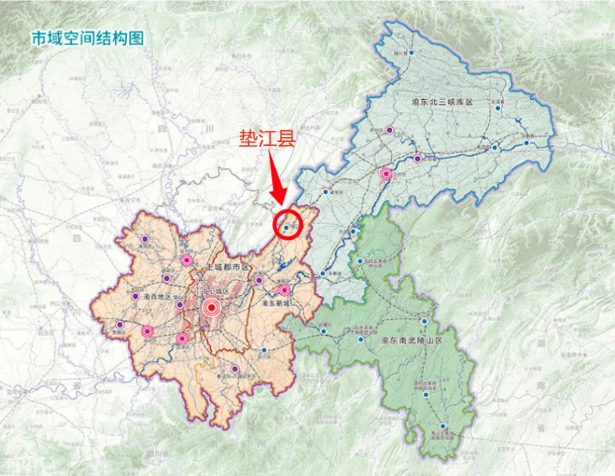 主城都市区又被划分为三个片区,分别是中心城区、渝西地区和渝东新城。中心城区为原主城9区,是重庆最核心的区域;渝西地区为江津区、合川区、永川区、璧山区、荣昌区、大足区、铜梁区、潼南区;渝东新城为涪陵区、长寿区、南川区、綦江区-万盛经开区、垫江县。