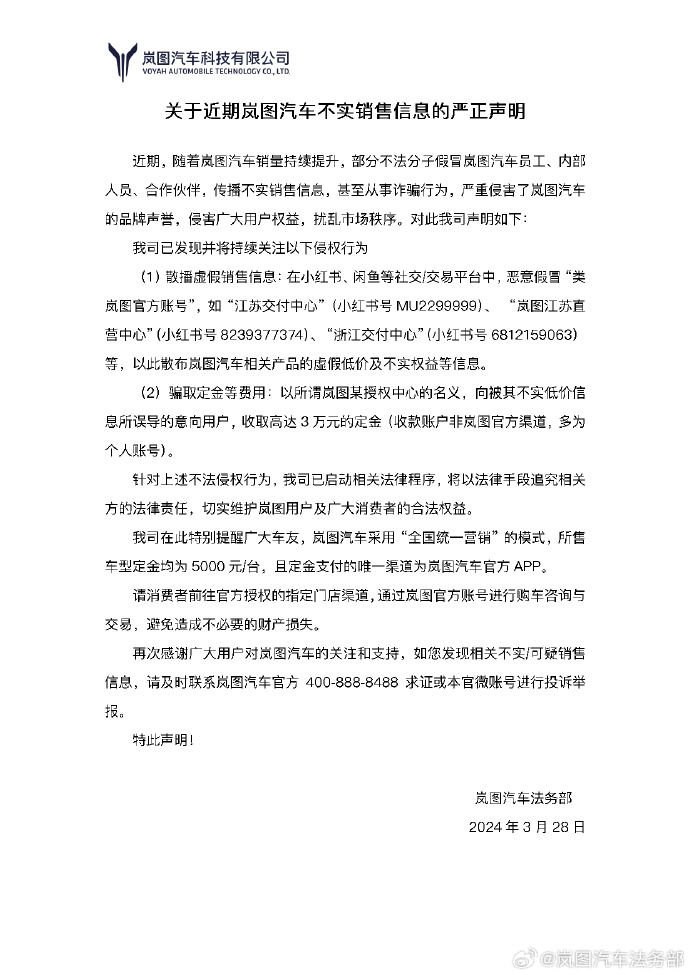 3月28日,岚图汽车法务部发布声明称,近期部分不法分子假冒岚图汽车员工、内部人员、合作伙伴,传播不实销售信息,甚至从事诈骗行为。针对上述不法侵权行为,公司已启动相关法律程序,将以法律手段追究相关方的法律责任。岚图汽车提醒,公司采用“全国统一营销”的模式,所售车型定金均为5000元/台,且定金支付的唯一渠道为岚图汽车官方APP。