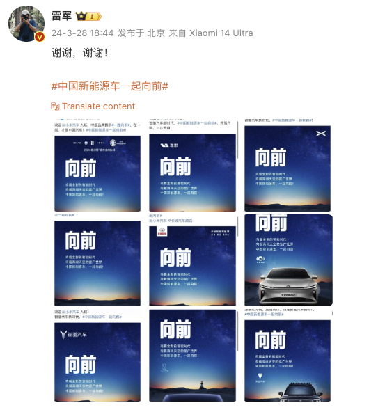 3月28日晚间,比亚迪、长城汽车、理想汽车、小鹏汽车等多家新能源车企在官方账号发文,欢迎小米汽车入场。对此,小米董事长雷军回应,“谢谢,谢谢!”