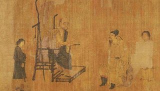 先来介绍下上图的人物关系,右边带冠的男子叫萧翼,是本次故事的男主角,左边坐在木椅上的和尚便是《兰亭集序》的藏主辩才。