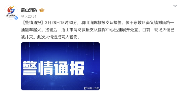@眉山消防 通报,3月28日18时30分,眉山消防救援支队接警,位于东坡区尚义镇刘庙路一油罐车起火。接警后,眉山市消防救援支队指挥中心迅速展开处置。目前,现场火情已被扑灭。此次火情造成两人轻伤。