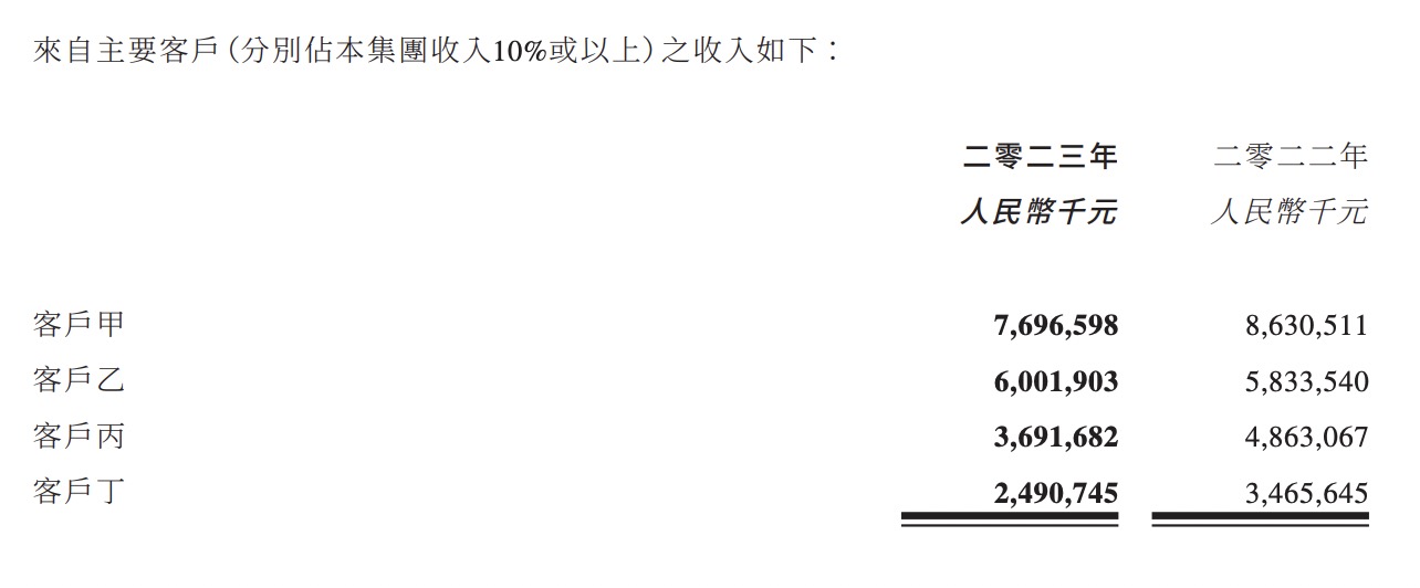 在2023年财报中,申洲国际没有具体披露公司的主要客户名称,仅以客户甲乙丙丁指代公司的四大主要客户。不过,根据过去几年的公告和多个投行的研报不难推测,2023年申洲国际的四大客户仍是耐克、优衣库、阿迪达斯和彪马。从这份财报上看,除了客户乙,其他三大客户贡献的收入在2023年均有降低。