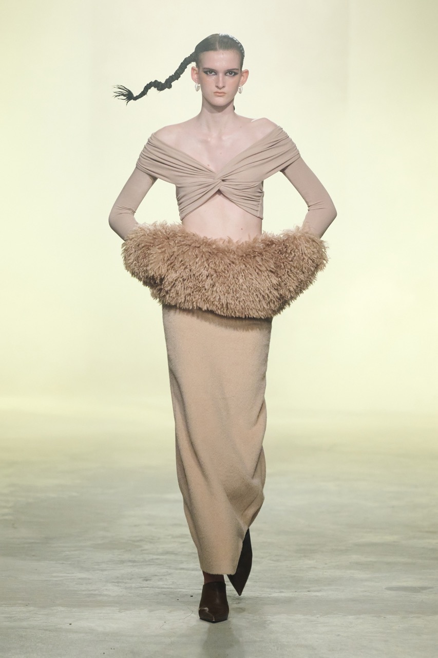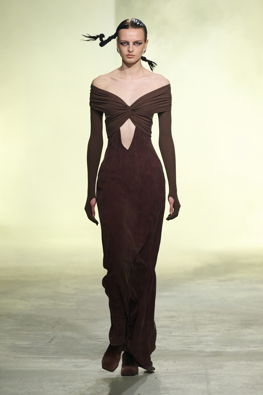 一声隆隆的鼓点响起,T台两侧射烟雾缭绕,仿佛已进入烟花绽放的视觉盛宴。模特身着一袭棕色弹力针织连身裙,环绕身体如同柔软却坚硬的盔甲,寓意力量与保护;另一件飘逸的砂洗铜氨丝礼服裙,流苏垂坠如同火花迸溅。