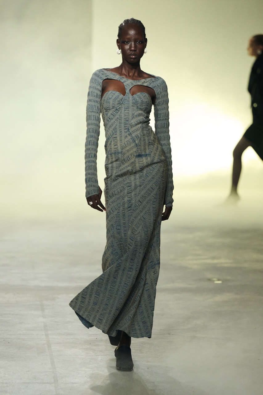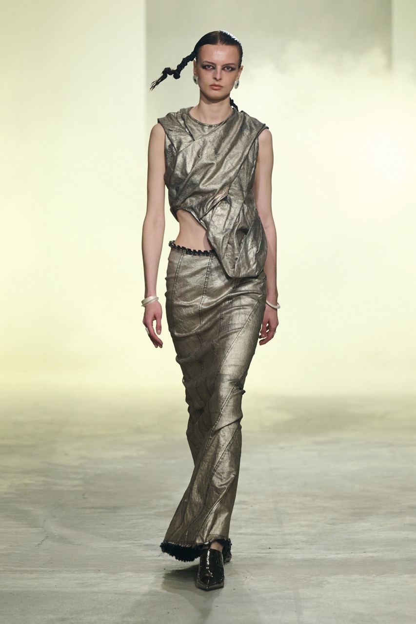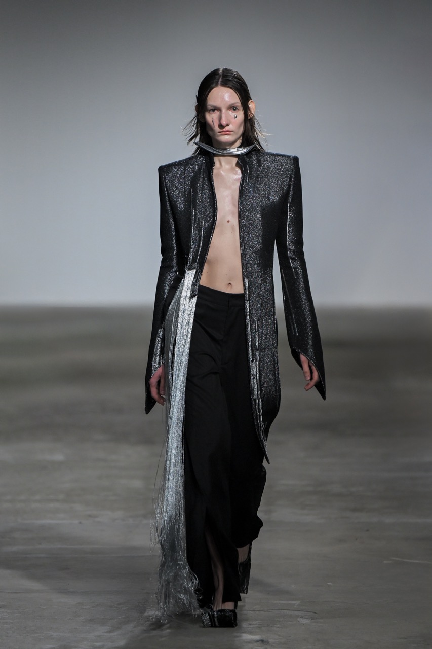 设计师将男女装工艺完美结合,既有剪裁利落的无领夹克,彰显女性独有气魄;又有盐缩牛仔缝制的鱼尾裙,巧妙融合经典男装元素于女性曲线之上。烫金工艺、石磨洗水使牛仔布料显现出被扭曲破坏感,如同残垣断壁般割裂摧枯拉朽的美感。
