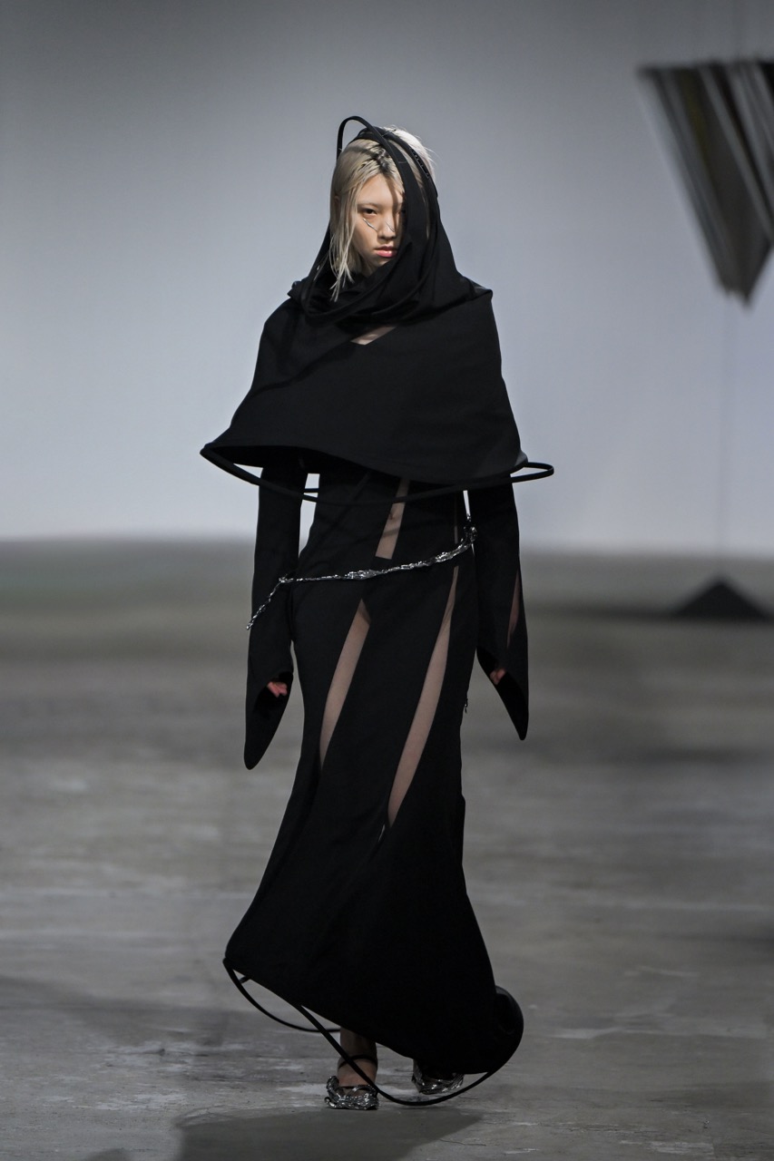 系列造型由沉稳质朴的黑、白、灰等深色基调贯穿始终,线条笔挺利落,在灵动和严肃间博弈。面料的叠加与拼贴、细长又宽阔的衣领等细节,赋予每一件作品丰富的层次感。