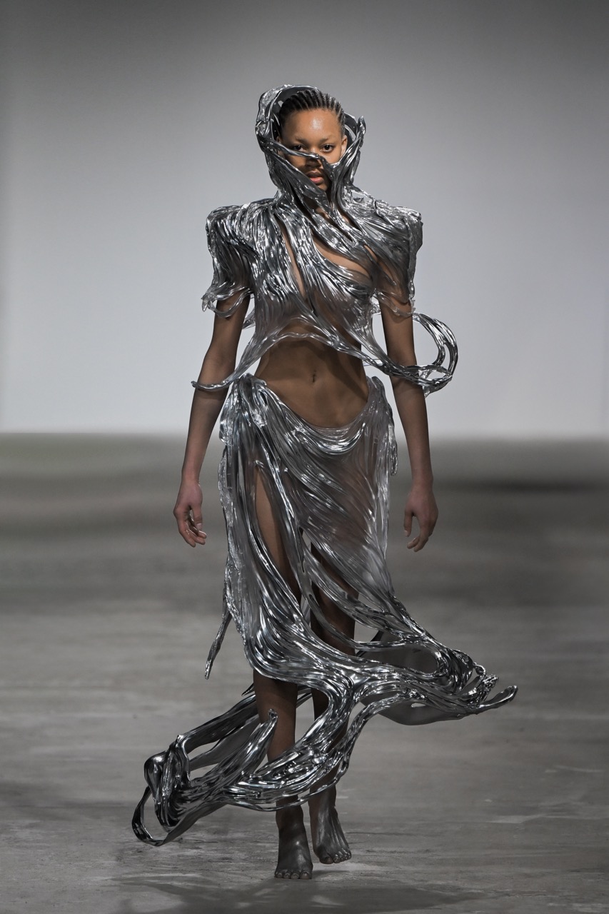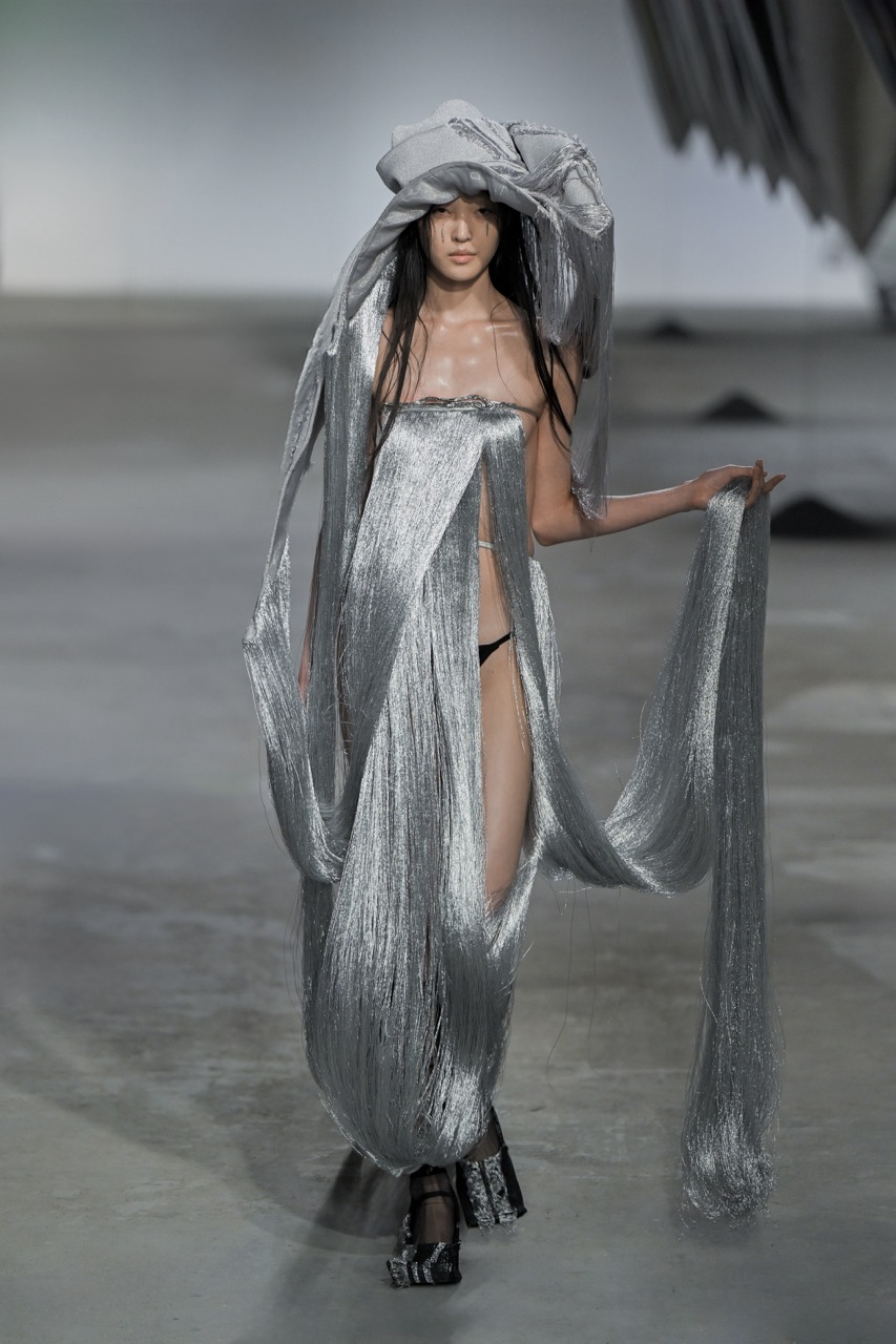 伴随音乐的激昂鼓点,首位模特步入T台,金属丝编织长裙张扬露骨却又不失优雅含蓄。设计师魏然将叛逆与柔美、野性与细腻,完美地融合于单品之中。
