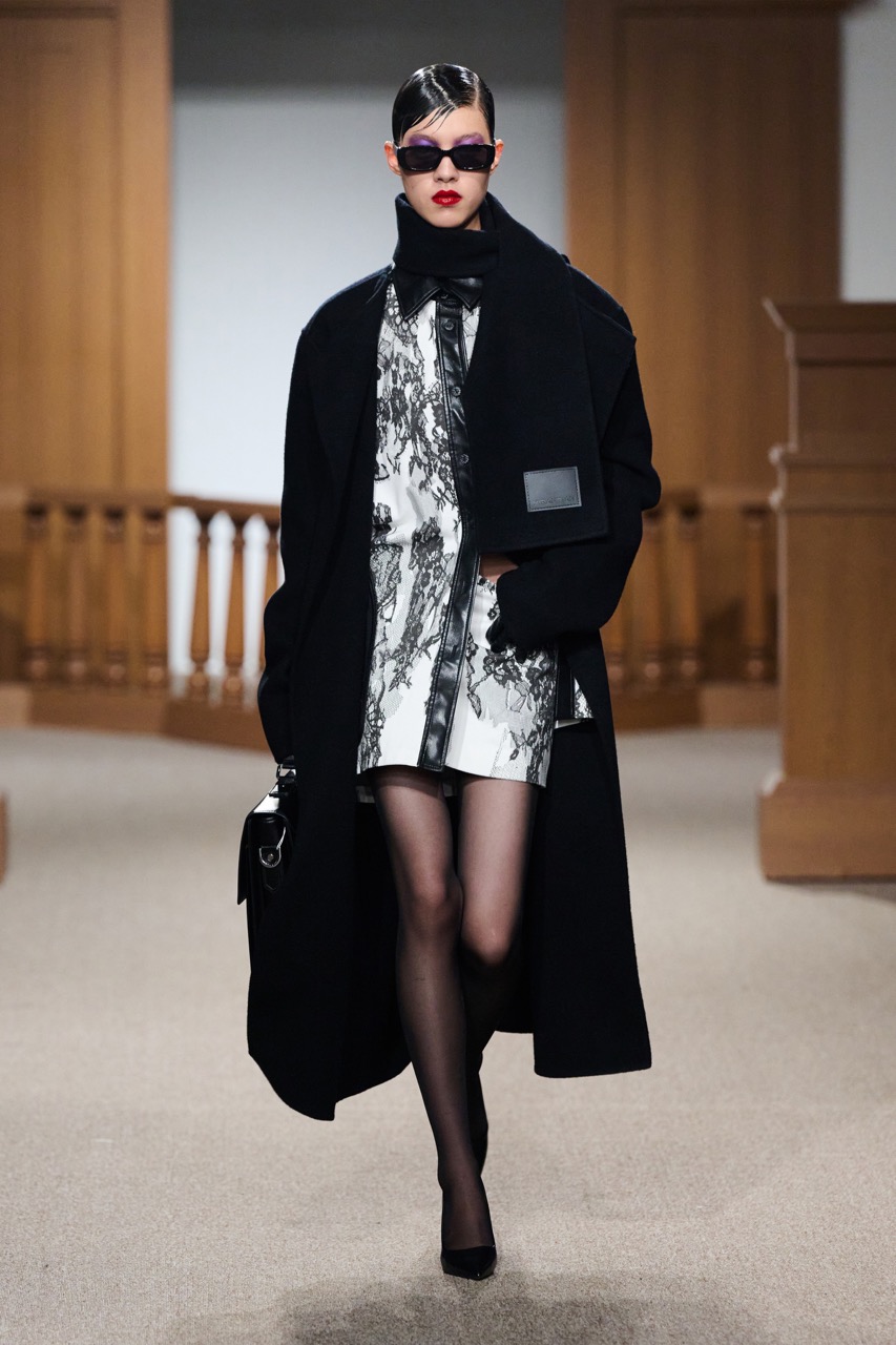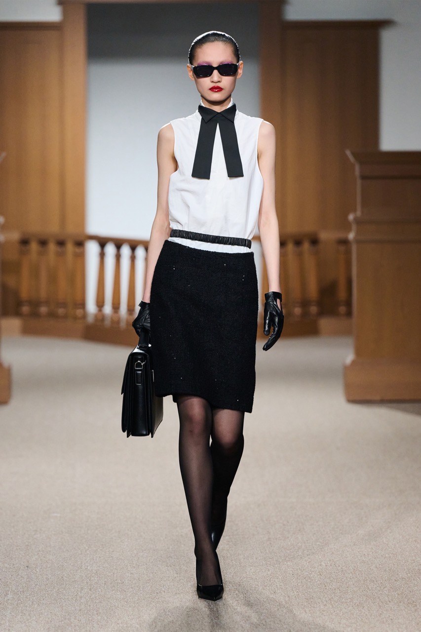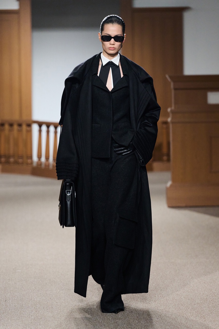 秀场穹顶高悬的顶灯将光影投射在穿梭于法庭隔板间的模特身上,令人联想到黑夜中携着提灯游走的漫游者。设计师巧妙地将这一意象融入系列设计,展现出女性内在的睿智与坚韧。