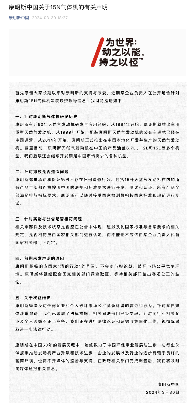 3月30日晚,康明斯中国官微发布声明,承诺和保证绝对不存在任何造假行为。声明称,包括15升天然气发动机在内的所有产品全部都严格按照中国的法规和标准要求进行开发、测试和认证,所有产品全部满足排放指标要求,康明斯可以随时接受国家检测机构按国家标准和规范进行测试。康明斯中国表示,针对某自媒体涉嫌诽谤,已采取了法律措施,相关司法部门已经受理。针对同行业相关企业及个人涉嫌不正当竞争,正在进行法律论证和证据收集固化工作,视情况采取进一步法律行动。
